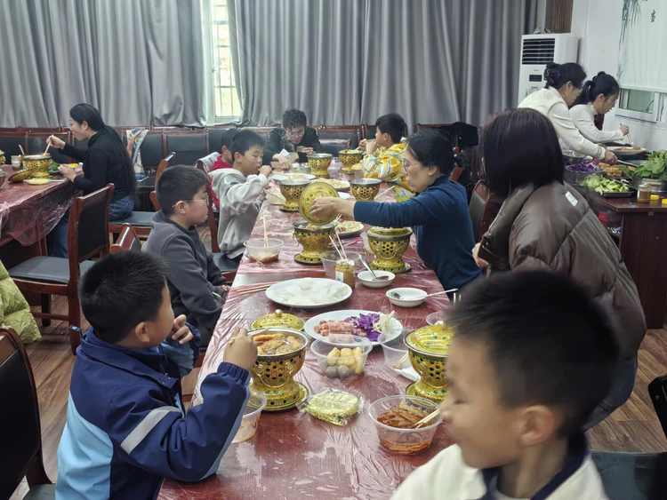 活动伊始,志愿者们便早早备好了丰富新鲜的食材。鲜香浓郁的骨汤底、酸甜开胃的番茄汤底咕嘟作响,各类丸子、时蔬、菌菇整齐码放,琳琅满目。孩子们围坐一堂,一边兴致勃勃地分享着才艺表演的趣闻轶事,一边亲手涮煮心仪的食材;舞台之上,小表演者们轮番登场,个个自信昂扬,歌声、掌声与欢笑声此起彼伏。在热气腾腾的烟火气里,大家你一言我一语,于美食与欢笑中感受着集体的温暖,共同迎接崭新一年的到来。